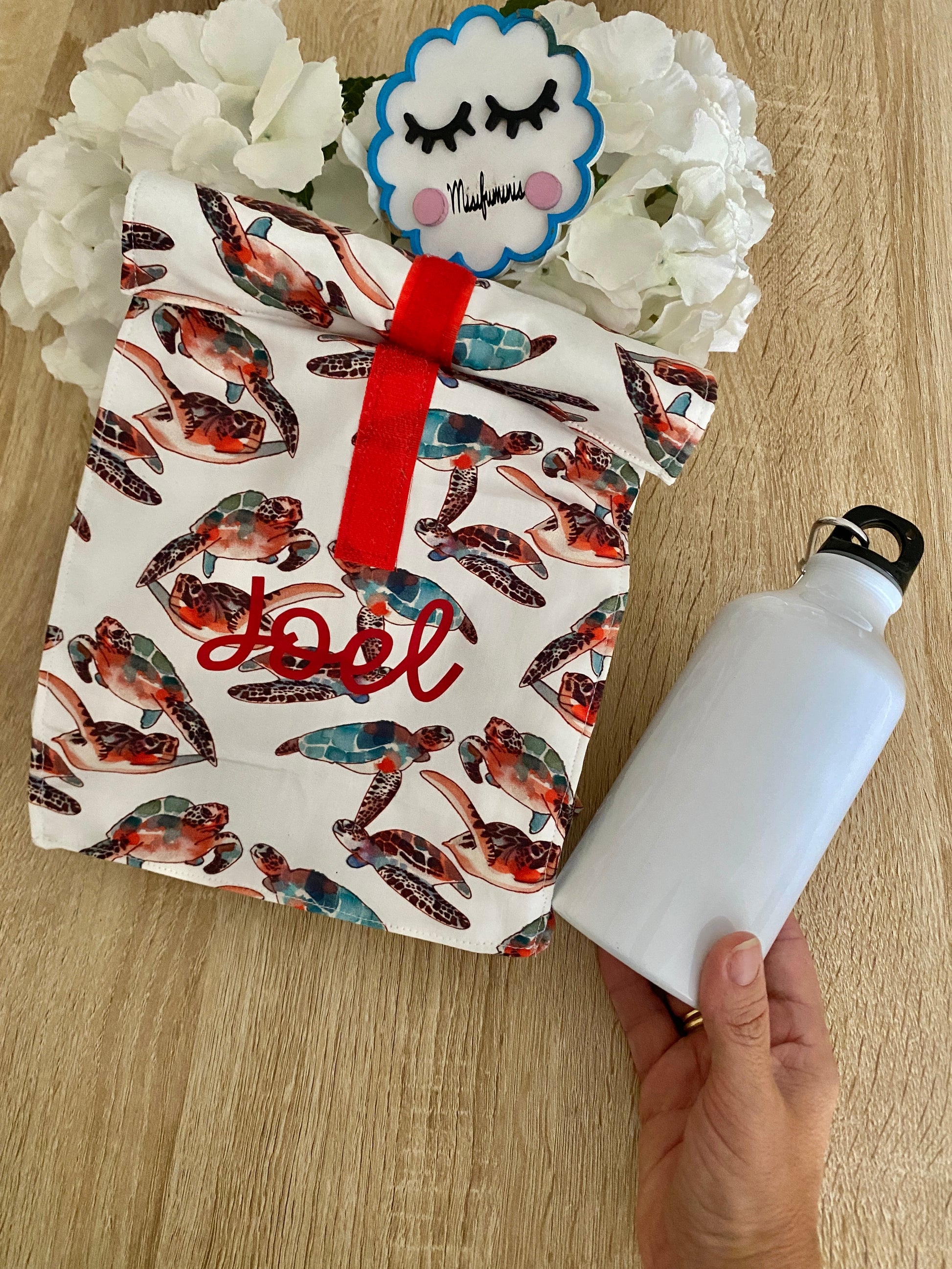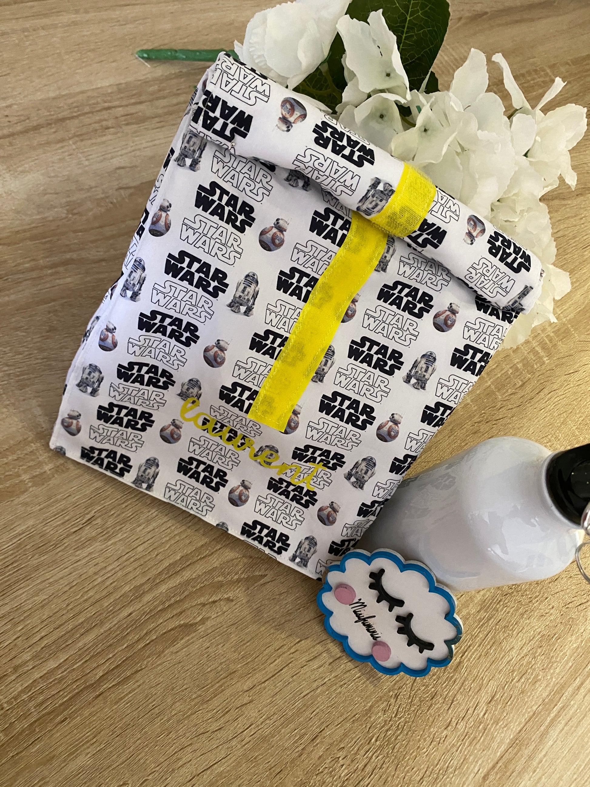 Ideal para peques con estilo, esta práctica bolsa está confeccionada con tela divertida de Star Wars y personalizada con el nombre. En su interior plastificado facilita la limpieza y desinfección, perfecta para el uso diario.