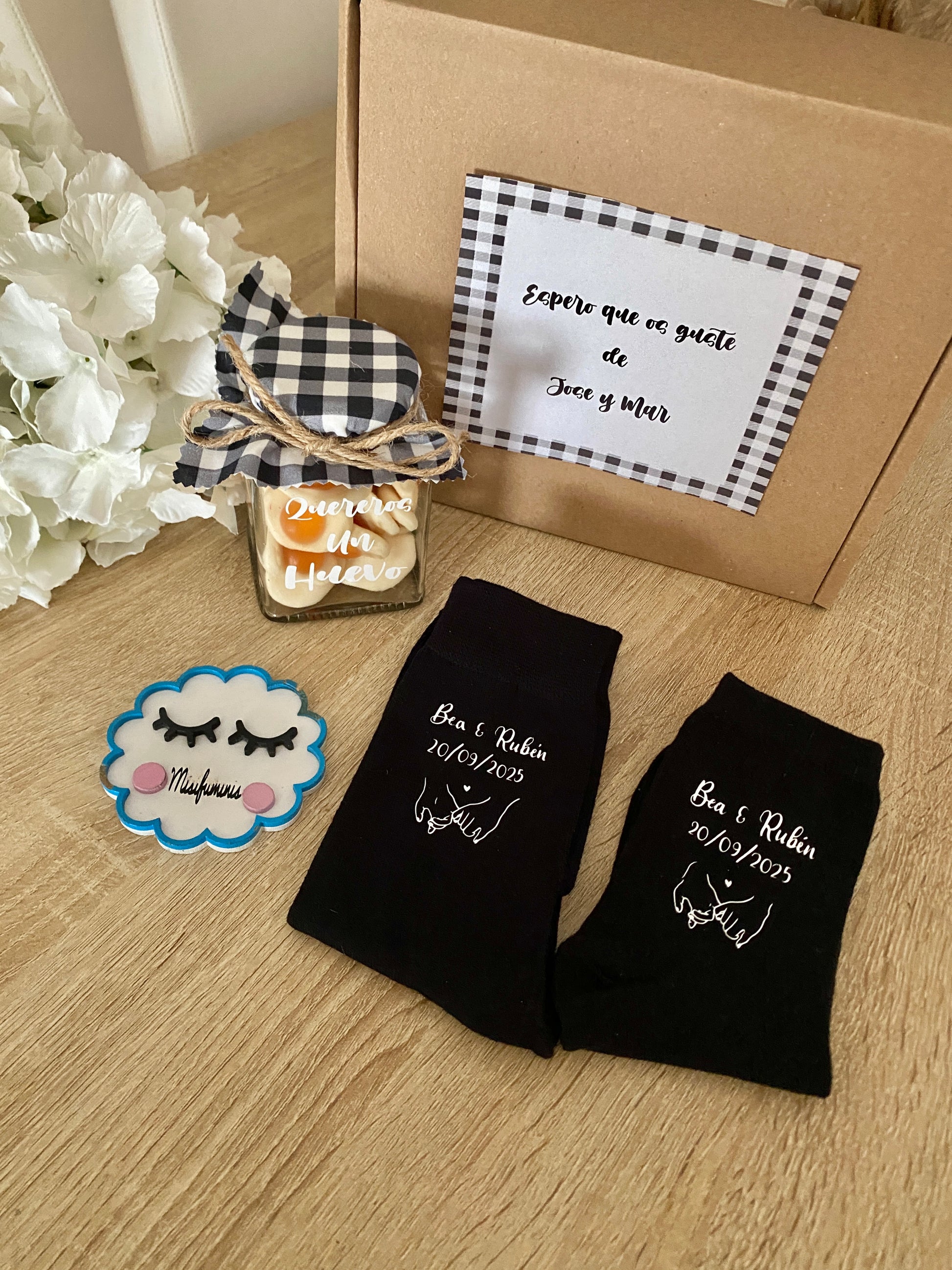 Este set personalizado incluye un tarro con golosinas con la frase “Queremos un huevo”, calcetines con la fecha de la boda y un packaging ideal para regalar. Perfecto para sorprender a tus invitados o como detalle de pareja